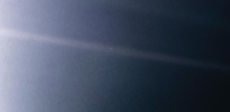 To similar effect, though less vivid, is the later “Pale Blue Dot” photograph made famous by Carl Sagan (NASA, Voyager 1, February 14, 1990).